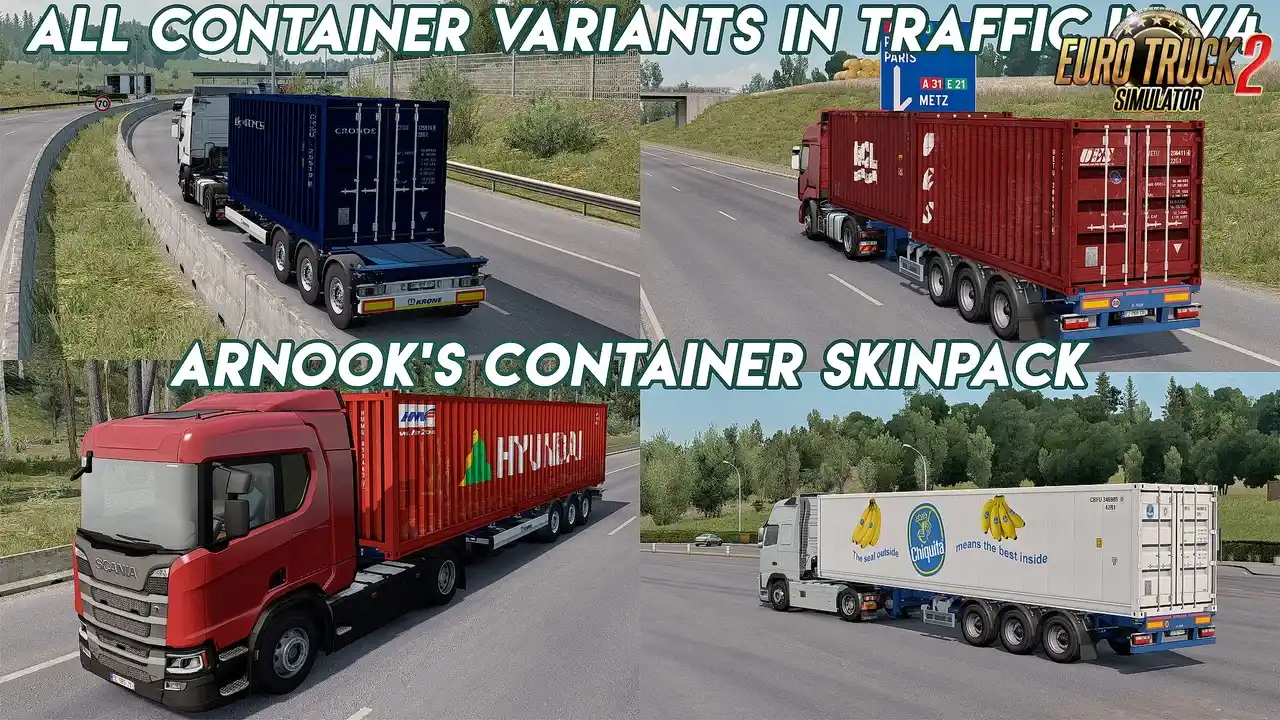 مد پروژه رنگ برای کانتینرها Arnook's یکی از بهترین بستههای گرافیکی مخصوص کانتینرها در بازی ETS2 است که توسط Arnook ساخته شده و تمرکز اصلی آن، اضافهکردن پوستههای واقعی، متنوع و باکیفیت برای کانتینرهای 20 و 40 فوت است.