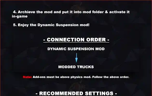مد سیستم تعلیق فعال برای تمامی کامیون ها ساختهی TheTiger و SCS Software برای بازی Euro Truck Simulator 2، سیستم تعلیق فعال و واقعگرایانه را به تمام کامیونهای بازی اضافه میکند.